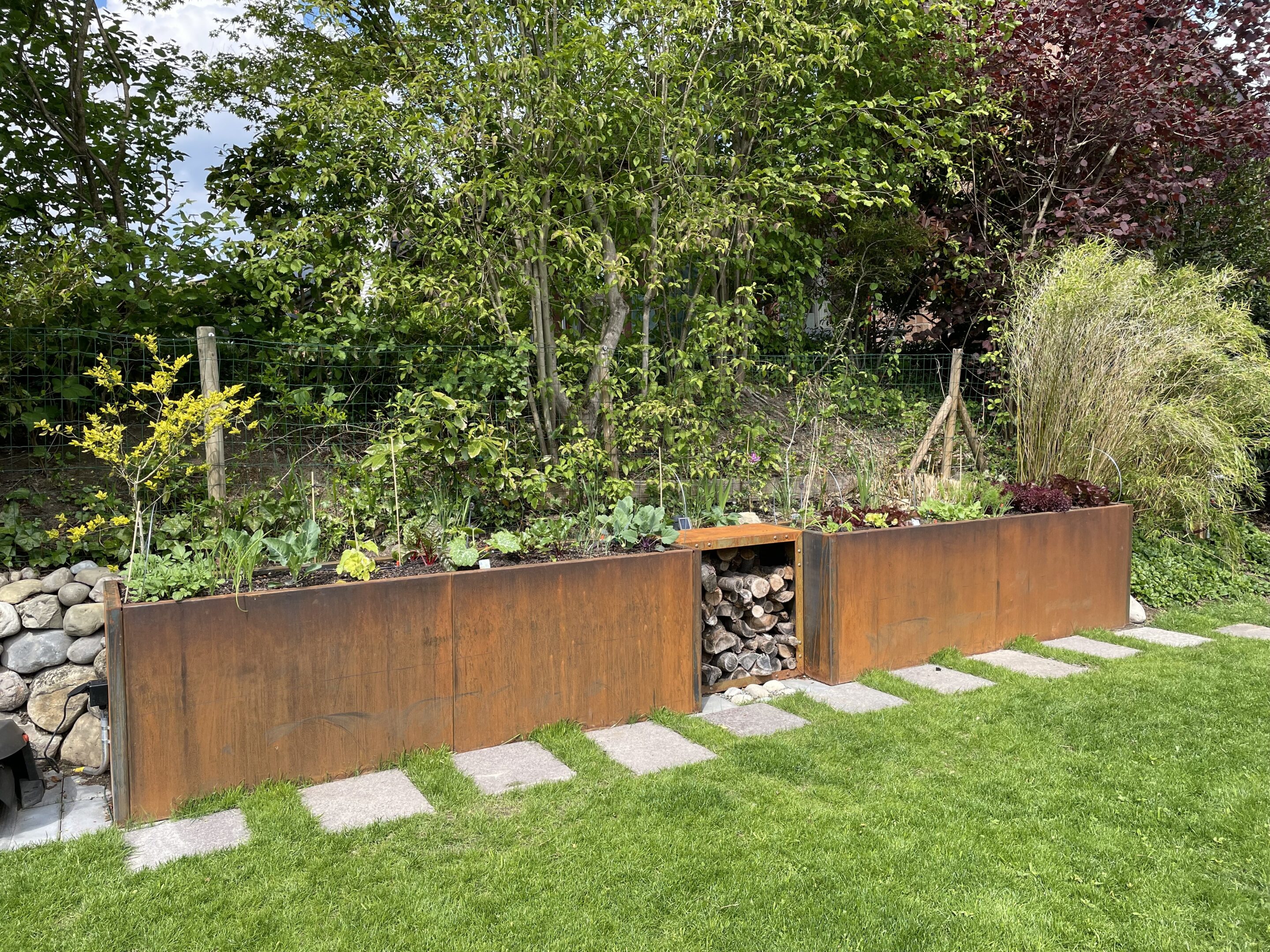 Der rohe Stahl entwickelt im Laufe der Zeit eine natürliche Rostpatina, die von Silbergrau zu einem warmen Rostrot übergeht. Dieser Alterungsprozess verleiht jedem Brennholzregal eine individuelle Optik, die Ihren Garten stilvoll bereichert.