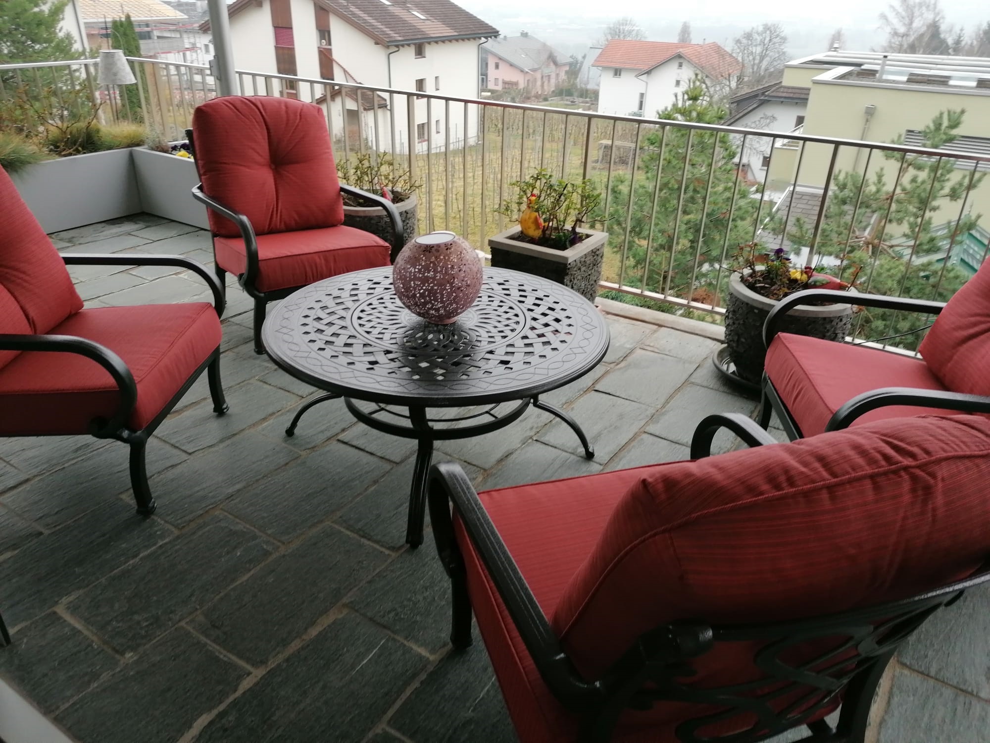 Der Tisch und die Sessel sind in einem eleganten Anthrazitton pulverbeschichtet, was nicht nur für eine edle Optik sorgt, sondern auch den Schutz vor äusseren Einflüssen erhöht. Aluminiumguss ist besonders robust und widersteht selbst anspruchsvollen Witterungsbedingungen mühelos.